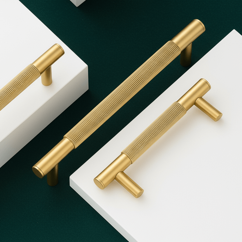 Maniglia in ottone massiccio spazzolato con superficie zigrinata. Un modello moderno e uno dei nostri bestseller assoluti in negozio. Perfetta sia per le ante della cucina che per il mobile del bagno o altri arredi. Il suo peso solido, combinato con i dettagli zigrinati, non passa inosservato. Una maniglia premium per chi apprezza la cura dei dettagli e la qualità.