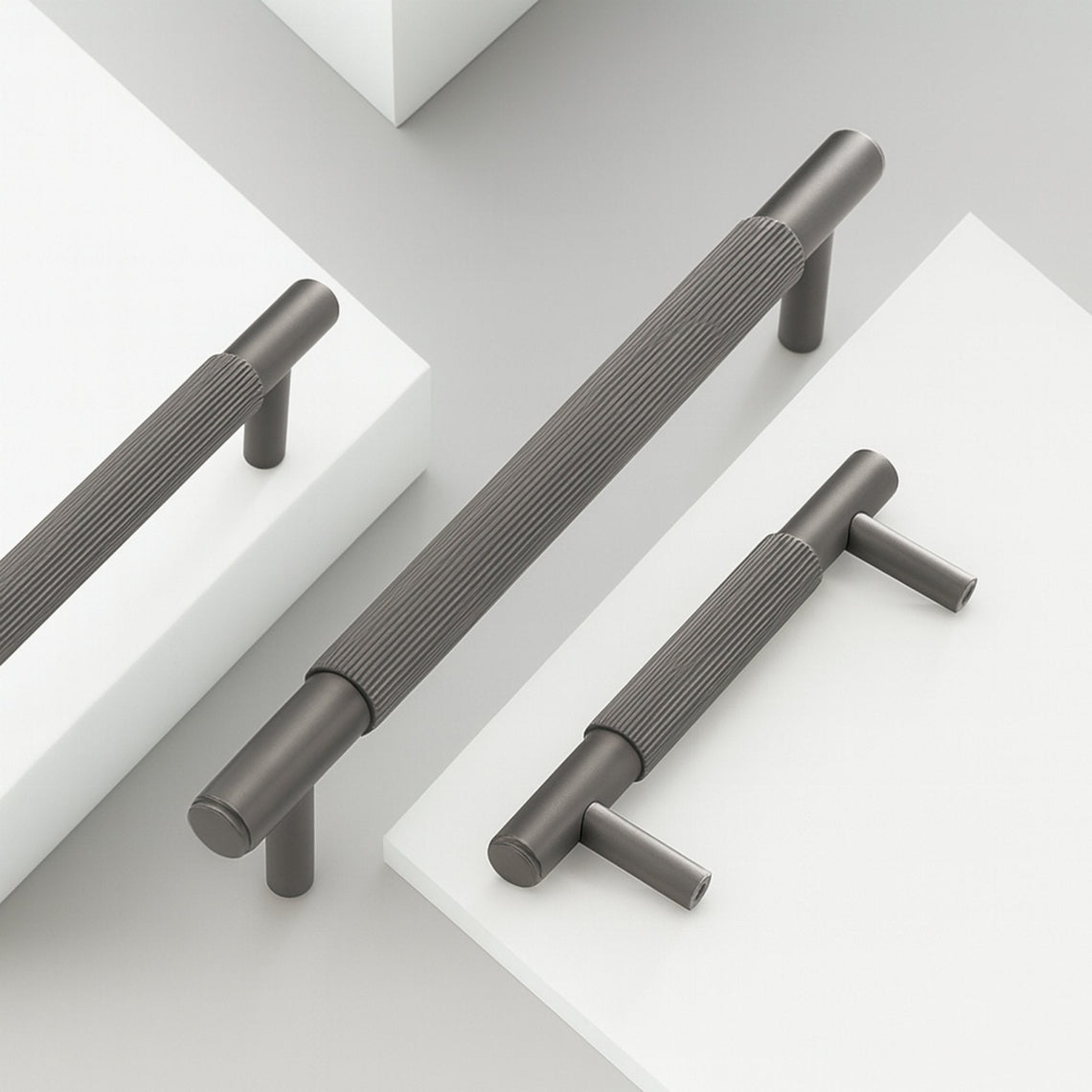 Grått handtag i solid mässing med räfflad yta. Ett modernt handtag och en av våra absoluta storsäljare i butiken. Passar likväl på köksluckorna som för badsrumskomoden eller på möblemang. Dess gedigna tyngd i kombination med de räfflade detaljerna går inte obemärkt förbi. Ett premiumhandtag för dig som värdesätter detaljrikedom och kvalité.